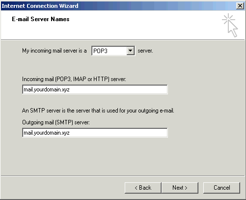 Mail servers for Incoming and outgoing messages have to be filled out in the following way mail.yourdomain.xyz (where yourdomain.xyz is your full domain name). POP3 is an incoming mail server and and SMTP is outgoing mail server. Then, click on "Next".