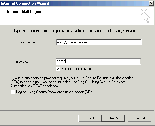"Account name" is the same as your e-mail address and the password is your e-mail password. Leave unchecked box "Log on using Secure Password Authentication".