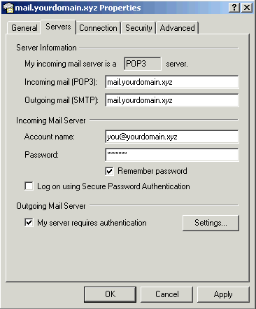 You must do the following step to be able to send any mail: click on the "Servers" tab at the next screen. Check the box named "My server requires authentication" for Outgoing Server. Click "Okay".